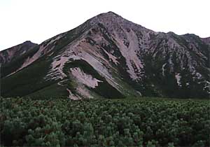 視線を大きく右に振ると三俣蓮華岳が頭に朝日を受け輝いている。すばらしい光景だ。