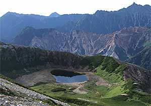 山荘から50分ほど歩いて、やっと鷲羽池が見えるところまで辿り着いた。背景に槍、北釜尾根や硫黄尾根の赤壁を従えて、誇らしげに