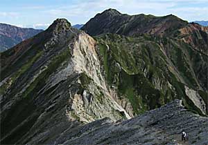 振り返ると目の前には三俣蓮華や黒部五郎が雄大に広がっている。昨日1日がかりで歩いて来たコースや尾根筋を目で逆に辿って
