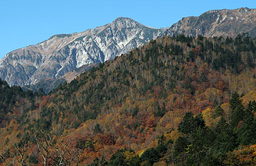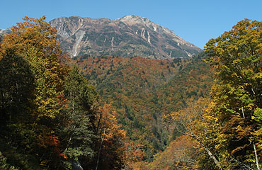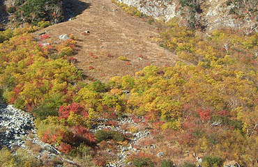 ↑ ババ平と大曲の中間点付近、登山道対岸の紅葉