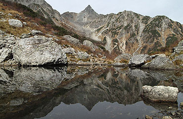 分岐点を過ぎると、カール地形の斜面を巻き気味に横切って、高度を上げて行く。40分ほど歩くと、巨石がゴロゴロ 転がる平坦地に出る。その一角にバレーボールのコートほどの広さの小さな池がある。天狗池である。この池に映る逆さ槍は 「一見の価値あり」という評判がある。上空には少し薄雲がかかっているが、風はほとんどない。水面に映る風景を見るには いい条件である。