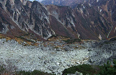 小槍(左)に見送られながら、急なガレ場の斜面をジグザグに進路を曲げながら、高度を下げて行く。前方には西鎌尾根が 波打つように伸び、その向こうには飛騨から黒部の山並が広がっている。