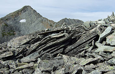 ↑ 板のように薄く割れた岩石群。中岳直下の尾根にて。