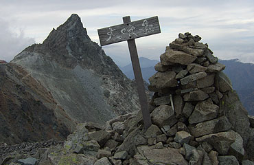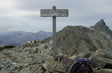 ↑ 13:37 中岳(3084m)山頂。次第に槍が大きく見えて来た。