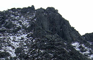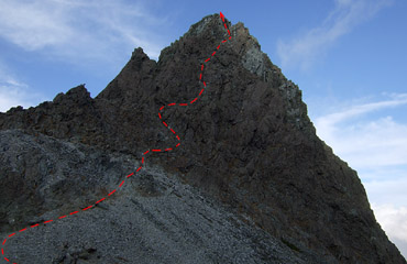 ↑ 槍ヶ岳山荘から仰ぎ見る槍ヶ岳。点線に沿って這い上がる。