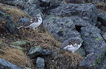 ↑ 千丈乗越付近で出会ったライチョウ親子(画面の外にもう1羽)。
