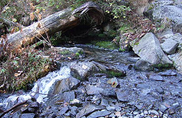 ↑ 滝谷を挟んで避難小屋の向い、藤木レリーフのすぐ横の湧水。