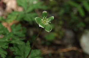 清滝小屋を過ぎた辺りから、ニリンソウの姿は少し増えてきた。目を皿のようにして探しながら歩き、やっと見つけたのがこの花。 全体が”完全な緑”という訳には行かず、花びら(注:正確には萼弁)の先端に白の縁取りが入っている。開花して幾分日数が 経っていて、所々黄変し始めていることや、昨日台風4号がらみで降った大雨か何かで跳ね上げられたであろう泥が付着して、やや 汚れた風情だが贅沢は言えない。