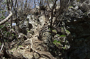 清滝小屋を過ぎると、コースは更に勾配を強め難度を増す。何箇所か左のような”プチ”鎖場もあり、腕力任せによじ登る場面も 増えてくる。