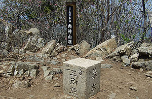 をゲット。 ピークの岩場から1mほど下がったところに、二等三角点の標柱が立てられている。さらに50cmほど下がったところに山頂を示す標柱 が立つ。この位置で撮影して貰ったのだが、無意識に置いた右手の下は首のないお地蔵さんか何かだった。バチ当たりな体制だった (南無 ・・・)。