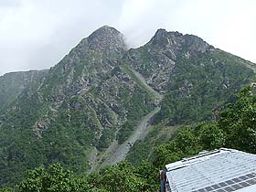 塩見小屋に辿り着いたところで小休止。この時、幸運なことにほんのわずかの間だけガスが切れ、山頂部分が顔を出してくれた。