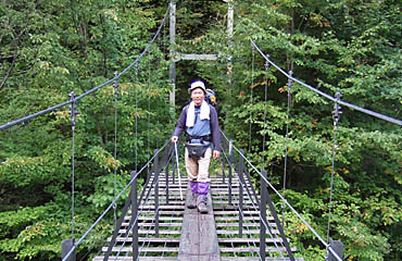 ↑ 山道に入って間もなく、奥西河内沢に架かる吊橋