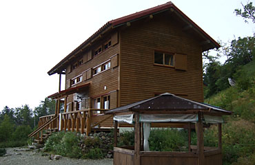 沢を巻くように緩やかなコースを登って行くと、やがて前方に山小屋が見え始める。千枚小屋である。外観で見る限り、真新しくて