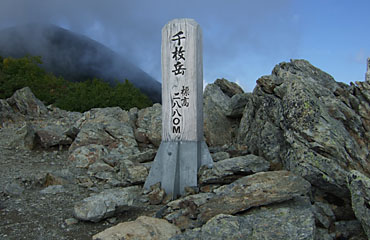 ややお疲れモードに加えて、少しきつくなった勾配を、我慢して歩き詰めて45分、千枚岳山頂に到着。