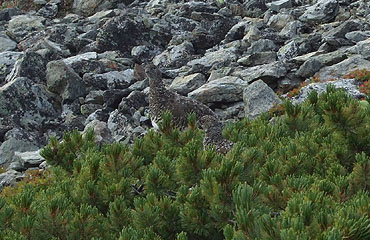 一旦50mほど下って、再び登る。ここで雷鳥の親子に遭遇。雛は2羽いたが、1羽はハイマツの茂みに潜ったまま、姿を見せることは