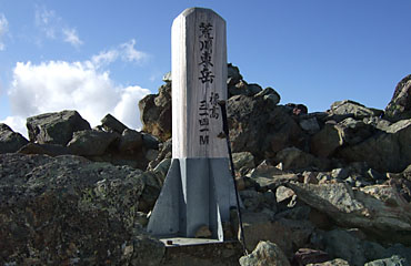 15:38、悪沢岳(別名:荒川東岳)山頂到着。ガスは幾分薄くなったが、周囲の山々を眺められる状態ではない。登頂の記録と