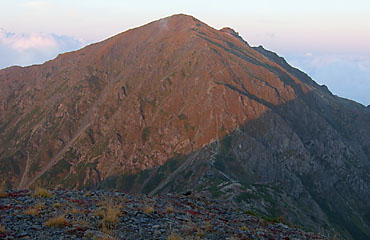 ↑ 夕陽に染まる悪沢岳 (Clickで拡大) |