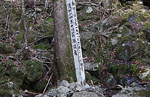 20分ほど歩いたところに、2つ目の源流点看板が立てられていた。今は完全に枯沢と化しているが、水量の多い時期にはここから