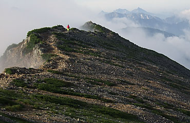 唐松山荘から先(南)は、一旦300mほど下る。これを下り切った最低鞍部辺りは、西斜面から押し寄せてきたガスが 稜線を越えようとして、東斜面の気流に押し戻されている現場である。通過した時点にも、尾根を挟んで左(東)はガスの海、右(西) はカラッと晴れて、鮮やかに塗り分けられていた。