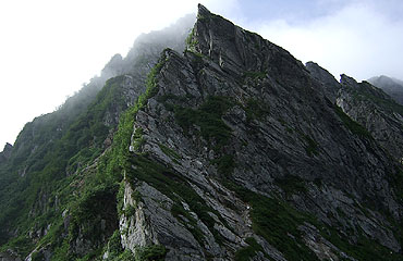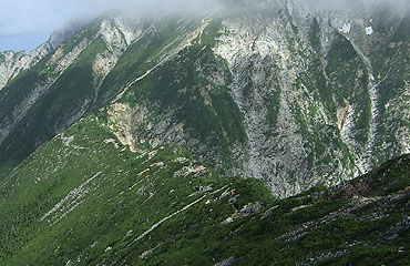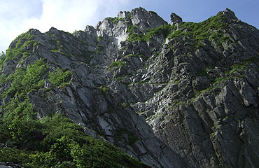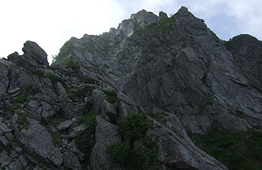 一峰を下って鞍部に辿り着くと、壁は更に迫力を増して迎えてくれた。高さは200mほどだが、コースは途中(ピーク直下のえぐれた 部分)で背後に回って迂回し、この壁をやり過ごす。迂回した先もスリルに満ちていることに違いはない。